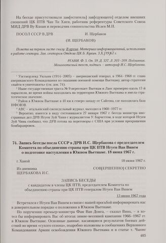 Запись беседы посла СССР в ДРВ И. С. Щербакова с председателем Комитета по объединению страны при ЦК ПТВ Нгуен Ван Винем о подготовке наступления в Южном Вьетнаме. Ханой, 18 июня 1967 г.