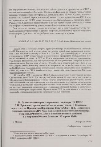 Запись переговоров генерального секретаря ЦК КПСС Л. И. Брежнева, председателя Совета министров А. Н. Косыгина, председателя Президиума Верховного Совета СССР Н. В. Подгорного с премьер-министром ДРВ Фам Ван Донгом и заместителем министра обороны ...