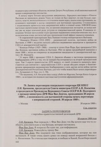 Запись переговоров генерального секретаря ЦК КПСС Л. И. Брежнева, председателя Совета министров СССР А. Н. Косыгина и председателя Президиума Верховного Совета СССР Н. В. Подгорного с премьер-министром ДРВ Фам Ван Донгом, проходивших 26 апреля 1968 г., о возможности для вьетнамской стороны начать переговоры с американской стороной. Москва, 30 апреля 1968 г.