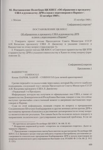Постановление Политбюро ЦК КПСС «Об обращении к президенту США и руководству ДРВ в связи с переговорами в Париже». Москва, 25 октября 1968 г.