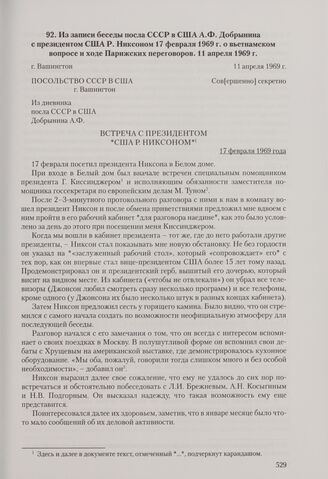 Из записи беседы посла СССР в США А. Ф. Добрынина с президентом США Р. Никсоном 17 февраля 1969 г. о вьетнамском вопросе и ходе Парижских переговоров. Вашингтон, 11 апреля 1969 г. // АВП РФ. Ф. 0129. Oп. 53. П. 399. Д. 5. Л. 53-55, 60, 62-69. Подлинник. Машинописный текст, подпись - автограф А. Ф. Добрынина. Опубл.: Советско-американские отношения. Годы разрядки. 1969-1972: Сборник документов. Т. 1: 1969 - май 1972. Кн. 1: 1969-1971. Док. № 5.