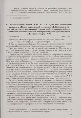 Из записи беседы посла СССР в США А. Ф. Добрынина с советником президента США по национальной безопасности Г. Киссинджером о возможности для американской стороны конфиденциального обмена мнениями с советской стороной по вопросам мирного урегулирования во Вьетнаме. Вашингтон, 3 марта 1969 г. // АВП РФ. Ф. 0129. Oп. 53. П. 399. Д. 5. Л. 105- 119. Подлинник. Машинописный текст, подпись - автограф А. Ф. Добрынина. Публикуется по: Советско-американские отношения. Годы разрядки. Т. I. Кн. 1. Док. № 10.