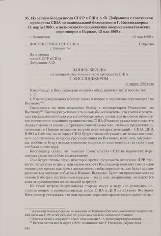 Из записи беседы посла СССР в США А. Ф. Добрынина с советником президента США по национальной безопасности Г. Киссинджером 11 марта 1969 г. о возможности продолжения американо-вьетнамских переговоров в Париже. Вашингтон, 13 мая 1969 г. // АВП РФ. Ф. 0129. Oп. 53. П. 399. Д. 5. Л. 143, 145-149. Подлинник. Машинописный текст, подпись - автограф А. Ф. Добрынина. Опубл.: Советско-американские отношения. Годы разрядки. Т. I. Кн. 1. Док. № 12.