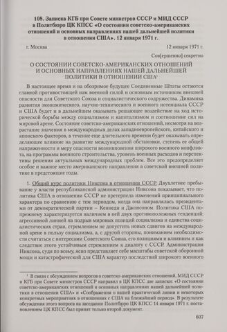 Записка КГБ при Совете министров СССР и МИД СССР в Политбюро ЦК КПСС «О состоянии советско-американских отношений и основных направлениях нашей дальнейшей политики в отношении США». Москва, 12 января 1971 г. // РГАНИ. Ф. 3. Oп. 68. Д. 1453. Л. 25-50. Копия. Машинописный текст. На л. 22 в том же деле сопроводительная записка Ю. В. Андропова и А. А. Громыко в Политбюро ЦК КПСС от 12 января 1971 г. (подлинник).