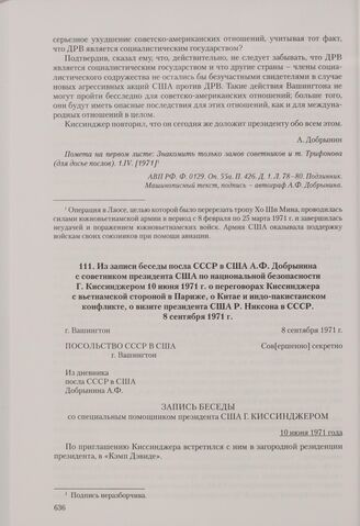 Из записи беседы посла СССР в США А. Ф. Добрынина с советником президента США по национальной безопасности Г. Киссинджером 10 июня 1971 г. о переговорах Киссинджера с вьетнамской стороной в Париже, о Китае и индо-пакистанском конфликте, о визите президента США Р. Никсона в СССР. Вашингтон, 8 сентября 1971 г. // АВП РФ. Ф. 0129. Oп. 55а. П. 426. Д. 2. Л. 1-4, 10. Заверенная копия. Машинописный текст. Опубл.: Советско-американские отношения. Годы разрядки. Т. I. Кн. 1. Док. № 163.