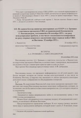 Из записи беседы министра иностранных дел СССР А. А. Громыко с советником президента США по национальной безопасности Г. Киссинджером, состоявшейся 30 сентября 1971 г. по ряду международных проблем, в том числе о возможности компромисса по ряду спорных вопросов о заключении мира и выводе войск США из Вьетнама. Вашингтон, 22 ноября 1971 г. // АВП РФ. Ф. 0129. Oп. 55а. П. 426. Д. 2. Л. 175, 177-180, 181-182. Заверенная копия. Машинописный текст. Опубл.: Советско-американские отношения. Годы разрядки. Т. I. Кн. 1. Док. № 205.