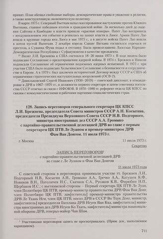Запись переговоров генерального секретаря ЦК КПСС Л. И. Брежнева, председателя Совета министров СССР А. Н. Косыгина, председателя Президиума Верховного Совета СССР Н. В. Подгорного, министра иностранных дел СССР А. А. Громыко с партийно-правительственной делегацией ДРВ во главе с первым секретарем ЦК ПТВ Ле Зуаном и премьер-министром ДРВ Фам Ван Донгом. Москва, 11 июля 1973 г.