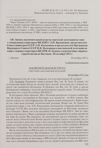 Запись заключительной встречи советской делегации во главе с генеральным секретарем ЦК КПСС Л. И. Брежневым, председателем Совета министров СССР А. Н. Косыгиным и председателем Президиума Верховного Совета СССР Н. В. Подгорным и вьетнамской делегации во главе с первым секретарем ЦК ПТВ Ле Зуаном о перспективах мирного строительства во Вьетнаме. Москва, 30 октября 1975 г. // РГАНИ. Ф. 80. Oп. 1. Д. 529. Л. 105-108. Подлинник. Машинописный текст, подписи - автографы А. С. Воронина и Р. Л. Хамидулина.
