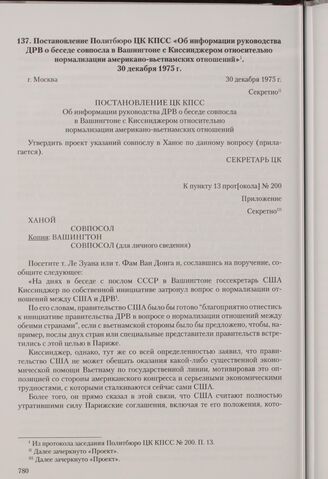 Постановление Политбюро ЦК КПСС «Об информации руководства ДРВ о беседе совпосла в Вашингтоне с Киссинджером относительно нормализации американо-вьетнамских отношений». Москва, 30 декабря 1975 г.