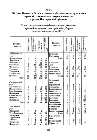 1912 год. Из отчета О ходе взаимного обязательного страхования строений, о количестве хуторов в волостях и уездах Новгородской губернии // ГИАНО. Ф. 98. Oп. 3. Д. 498. Л. 497 об.- 499 об.