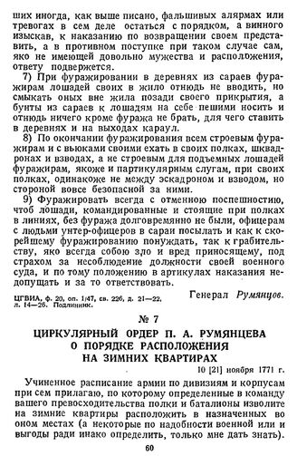 Главная Русские полководцы Фельдмаршал Румянцев Документы Циркулярный ордер П. А. Румянцева о порядке расположения на зимних ...