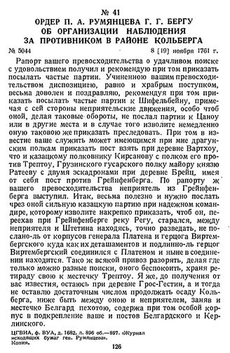 Ордер П. А. Румянцева Г. Г. Бергу об организации наблюдения за противником в районе Кольберга. 8 [19] ноября 1761 г. // ЦГВИА, ф. ВУА, д. 1682, л. 896 об.—897. «Журнал исходящих бумаг ген. Румянцева». Копия.