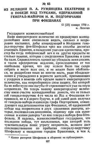 Из реляции П. А. Румянцева Екатерине II о победе над турками, одержанной генерал-майором И. М. Подгоричани при Фокшанах. 12 [23] января 1770 г., м. Летичев // ЦГВИА, ф. ВУА, д. 1868, л. 9—10. Подлинник.
