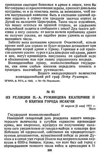 Из реляции П. А. Румянцева Екатерине II о взятии города Исакчи. 21 апреля [2 мая] 1771 г., Яссы // ЦГВИА, ф. ВУА, д. 1925, л. 91—91 об. Подлинник.