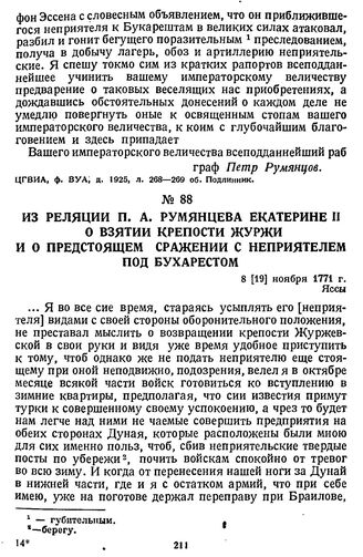 Из реляции П. А. Румянцева Екатерине II о взятии крепости Журжи и о предстоящем сражении с неприятелем под Бухарестом. 8 [19] ноября 1771 г., Яссы