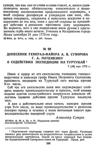 Донесение генерал-майора А. В. Суворова Г. А. Потемкину о содействии экспедиции на Туртукай. 7 [18] мая 1773 г. // ЦГВИА, ф. 52, д. 32, л. 81. Подлинник написан собственноручно Суворовым.