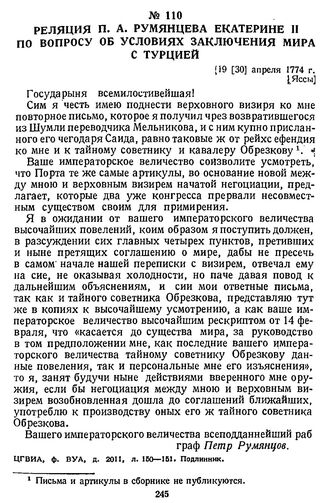 Реляция П. А. Румянцева Екатерине II по вопросу об условиях заключения мира с Турцией. 19 [30] апреля 1774 г., [Яссы]