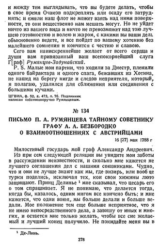 Главная Русские полководцы Фельдмаршал Румянцев Документы Письмо П. А. Румянцева тайному советнику графу А. А. Безбородко о в...