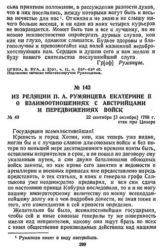 Из реляции П. А. Румянцева Екатерине II о взаимоотношениях с австрийцами и передвижениях войск. 22 сентября [3 октября] 1788 г., стан при Цоцоре // ЦГВИА, ф. ВУА, д. 2391, ч. II, л. 335—336. Подлинник.