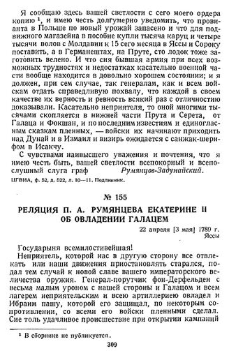 Реляция П. А. Румянцева Екатерине II об овладении Галацем. 22 апреля [3 мая] 1789 г., Яссы // ЦГВИА, ф. ВУА, д. 2405, л. 243—244. Подлинник.