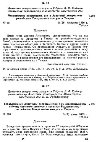 Донесение генерального консула в Тебризе Д. Ф. Кодинца Азиатскому департаменту Министерства иностранных дел. Министерство иностранных дел в Азиатский департамент российского Генерального консула в Тавризе. Тебриз, 14(26) февраля 1836 г. // Ф. «Главный Архив II-3», 1831 г., oп. 34, д. 8, л. 204а. Подлинник.