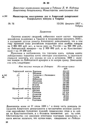 Донесение генерального консула в Тебризе Д. Ф. Кодинца Азиатскому департаменту Министерства иностранных дел. Министерство иностранных дел в Азиатский департамент российского Генерального консула в Тавризе. Тебриз, 12(24) февраля 1837 г. // Ф. «Главный Архив II-3», 1831 г., oп. 34, д. 8, лл. 241-245об. Подлинник.