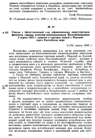 Список с представленной г-ну управляющему министерством финансов горным инженер-подполковником Воскобойниковым 3 марта 1845 г. записки о торговле нашей с Персиею через Каспийское море. 3 (15) марта 1845 г. // Ф. «Главный архив ІІ-3», 1836 г., oп. 34, д. 5, ч. 1, лл. 129—1ЗЗоб. Копия.