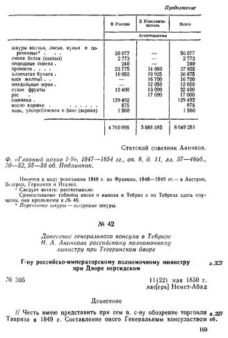 Донесение генерального консула в Тебризе Н. А. Аничкова российскому полномочному министру при Тегеранском дворе. Г-ну российско-императорскому полномочному министру при Дворе персидском. Лаг[ерь] Немет-Абад, 11 (22) мая 1850 г. // Ф. «Главный архив I-9», 1847—1854 гг., oп. 8, д. 11, лл. 319—323, 328—339.