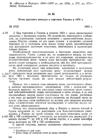 Отчет русского консула о торговле Гиляна в 1851 г. 1852 г. // Ф. «Главный архив I-9», 1847—1854 гг., oп. 8, д. 11, лл. 151-158об. Копия.