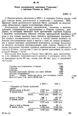 Отчет коллежского советника Гамазова о торговле Гиляна за 1854 г. [1855 г.] // Ф. «Главный архив I-9», 1847—1854 гг., oп. 8, д. 11, лл. 217—222об. Подлинник.
