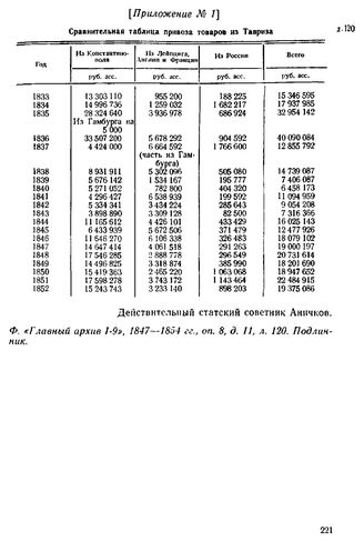 Приложение № 1 к Донесению временно управляющего генеральным консульством в Тебризе действительного статского советника Н. В. Ханыкова российско-императорскому поверенному при Дворе персидском. Г-ну российско-императорскому поверенному в делах при Дворе персидском Временно управляющего Генеральным консульством в Тавризе. Тебриз, март 1856 г. Сравнительная таблица привоза товаров из Тавриза // Ф. «Главный архив I-9», 1847—1854 гг., oп. 8, д. 11, л. 120. Подлинник.