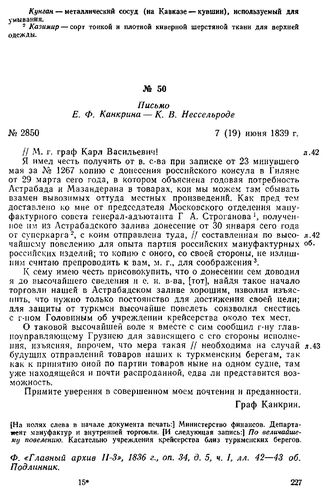Письмо Е. Ф. Канкрина — К. В. Нессельроде. 7 (19) июня 1839 г. // Ф. «Главный архив ІІ-3», 1836 г., oп. 34, д. 5, ч. I, лл. 42—43 об. Подлинник.