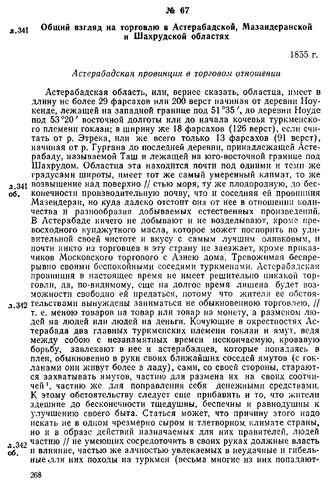 Общий взгляд на торговлю в Астерабадской, Мазандеранской и Шахрудской областях. 1855 г. // Ф. «Главный архив I-9», 1847—1854 гг., oп. 8, д. 11, лл. 341—351об. Подлинник.