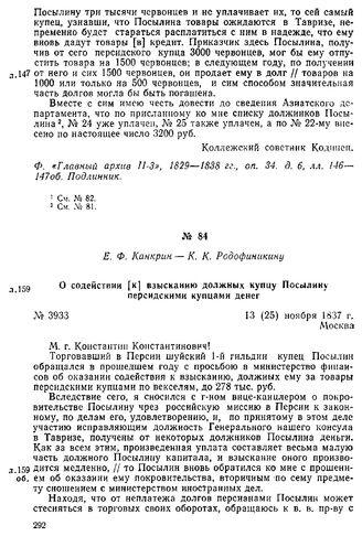Е. Ф. Канкрин — К. К. Родофиникину. О содействии [к] взысканию должных купцу Посылину персидскими купцами денег. Москва, 13 (25) ноября 1837 г. // Ф. «Главный архив ІІ-3», 1829—1838 гг., oп. 34, д. 6, лл. 159—159 об. Подлинник.