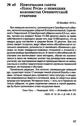 Информация газеты «Голос Руси» о немецких колонистах Оренбургской губернии. 29 декабря 1915 г. // Голос Руси. — Петроград, 1915. — 29 декабря (№ 707). ГАОО. Ф. 10. Oп. 4. Д. 446. Л. 20.
