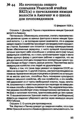 Из протокола общего собрания Уранской ячейки ВКП(б) о переселении немцев волости в Америку и о школе для проповедников. 12 февраля 1926 г. // ЦДНИ ОО. Ф. 1. Oп. 1. Д. 1045. Л. 4. Подлинник.