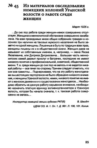 Из материалов обследования немецких колоний Уранской волости о работе среди женщин. Март 1926 г. // ЦДНИ ОО. Ф. 1. Оп. 1. Д. 961. Л. 100, 101. Копия.