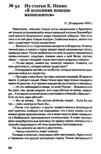 Из статьи К. Ненис «В колониях немцев-меннонитов». 17, 20 августа 1926 г. // Смычка. — Оренбург, 1926. — 17 августа. — С. 4; 20 августа. — С.2.