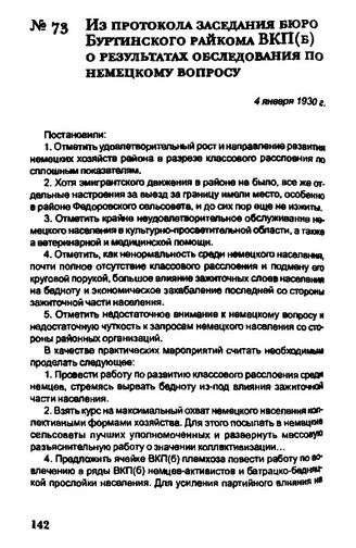 Из протокола заседания бюро Буртинского райкома ВКП(б) о результатах обследования по немецкому вопросу. 4 января 1930 г. // ЦДНИ ОО. Ф. 4. Оп. 2. Д. 161. Л. 1-3. Копия.