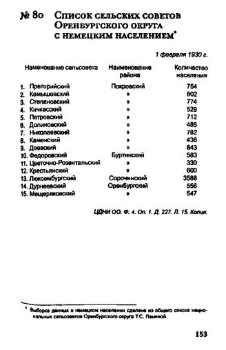 Главная Из истории оренбургских немцев 1817-1974 Список сельских советов Оренбургского округа с немецким населением....