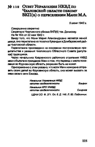 Ответ Управления НКВД по Чкаловской области обкому ВКП(б) о переселении Манн М. А. 5 июня 1942 г. // ЦДНИ ОО. Ф. 371. Oп. 6. Д. 146. Л. 83. Подлинник.