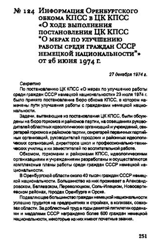 Информация Оренбургского обкома КПСС в ЦК КПСС «О ходе выполнения постановления ЦК КПСС "О мерах по улучшению работы среди граждан СССР немецкой национальности"» от 26 июня 1974 г. 27 декабря 1974 г.
