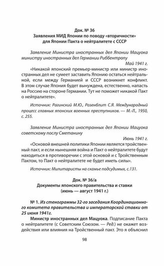 Заявления МИД Японии по поводу «вторичности» для Японии Пакта о нейтралитете с СССР. Май-июнь 1941 г. // Источник: Рагинский М.Ю., Розенблит С.Я. Международный процесс главных японских военных преступников. — М.-Л., 1950, с. 255. Источник: Милитаристы на скамье подсудимых, с. 131.