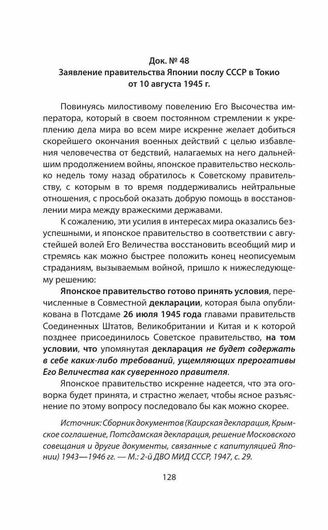Заявление правительства Японии послу СССР в Токио от 10 августа 1945 г. // Источник: Сборник документов (Каирская декларация, Крымское соглашение, Потсдамская декларация, решение Московского совещания и другие документы, связанные с капитуляцией Японии) 1943— 1946 гг. — М.: 2-й ДВО МИД СССР, 1947, с. 29.