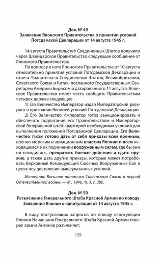 Разъяснение Генерального Штаба Красной Армии по поводу Заявления Японии о капитуляции от 14 августа 1945 г. // Источник: Внешняя политика Советского Союза в период отечественный войны. — Т. Ill, с. 384.