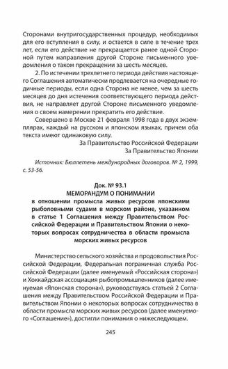 Меморандум о понимании в отношении промысла живых ресурсов японскими рыболовными судами в морском районе, указанном в статье 1 Соглашения между Правительством Российской Федерации и Правительством Японии о некоторых вопросах сотрудничества в области промысла морских живых ресурсов. Совершено в Москве 21 мая 1998 года