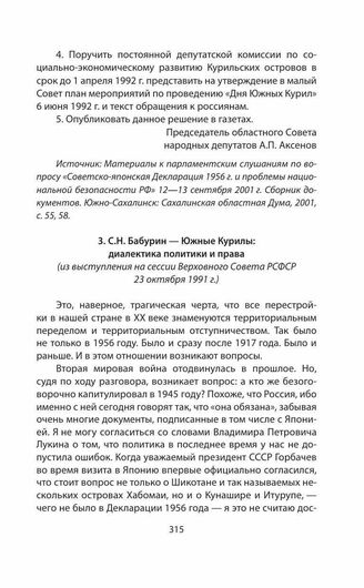 Обращения и заявления общественности и органов региональной власти страны (Сахалинской областной Думы) по проблеме Южных Курил в 1991—2014 гг. С.Н. Бабурин — Южные Курилы: диалектика политики и права (из выступления на сессии Верховного Совета РСФ...