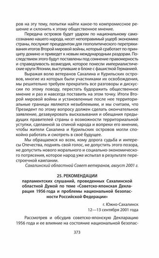 Обращения и заявления общественности и органов региональной власти страны (Сахалинской областной Думы) по проблеме Южных Курил в 1991—2014 гг. Рекомендации парламентских слушаний, проведенных Сахалинской областной Думой по теме «Советско-японская Декларация 1956 года и проблемы национальной безопасности Российской Федерации». Южно-Сахалинск, 12—13 сентября 2001 года // Источник: «Губернские ведомости», №176(1329) от 19.09.01; «Рыбацкие Новости», №25— 26 (444— 445), октябрь, 2001.