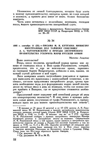1805 г. сентября 11 (23). — Письмо М.И. Кутузова министру иностранных дел тайному советнику А.А. Чарторижскому о просьбе австрийского правительства ускорить марш русской армии. Местечко Андрихау