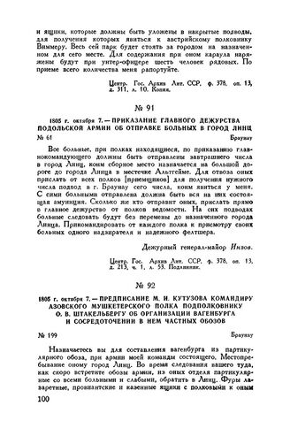 1805 г. октября 7. — Предписание М.И. Кутузова командиру Азовского мушкетерского полка подполковнику О.В. Штакельбергу об организации вагенбурга и сосредоточении в нем частных обозов. Браунау // Центр. Гос. Архив Лит. ССР, ф. 378, оп. 13, д. 312, л. 37 и об. Копия.